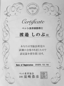 この度、ペット食育協会(APNA®)准指導士の認定試験に合格いたしました。